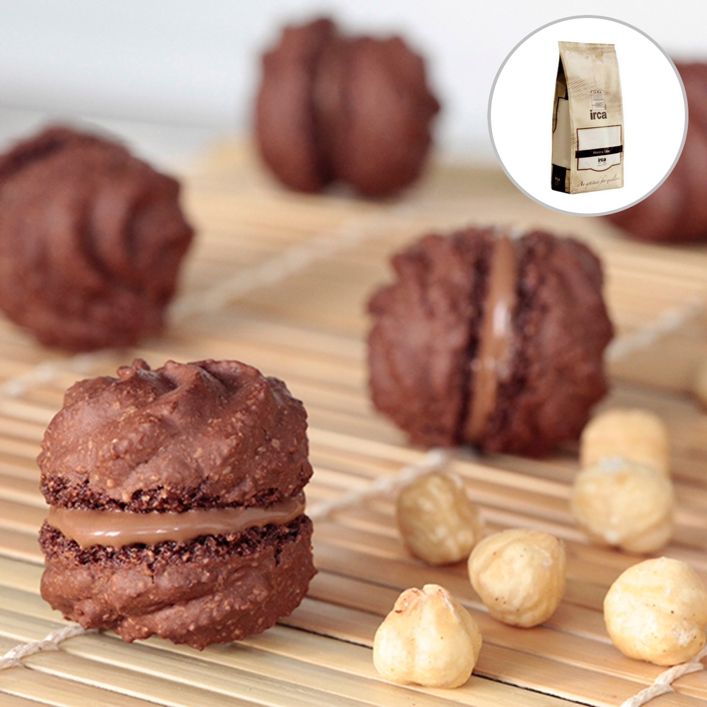 Směs v prášku z lískooříškové mouky a cukru pro přípravu petit fours, makrónek.