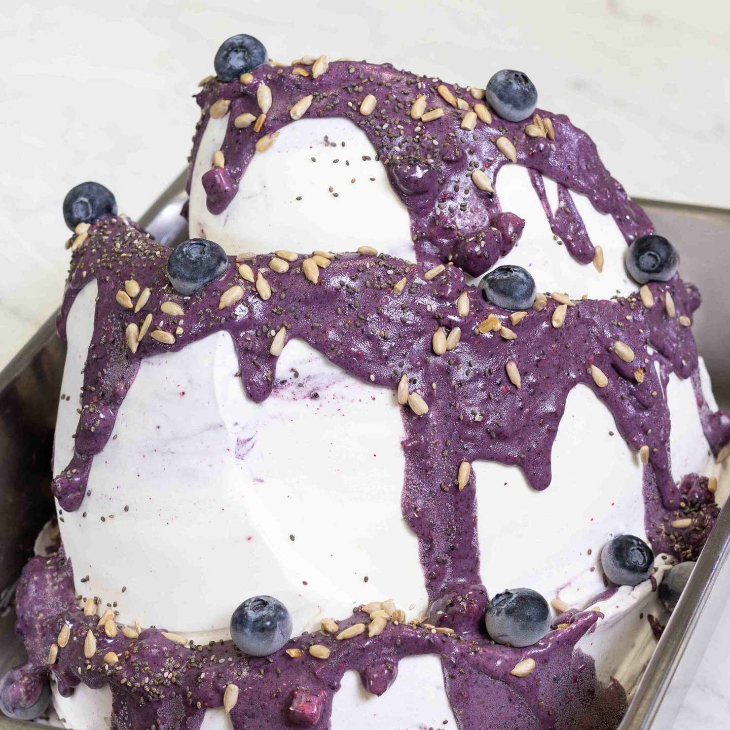 Vysoce kvalitní prémiové variegato z bílé čokolády a borůvek, s kousky chia semínek, slunečnicových semínek a lyofilizovaného ovoce. Bez lepku.